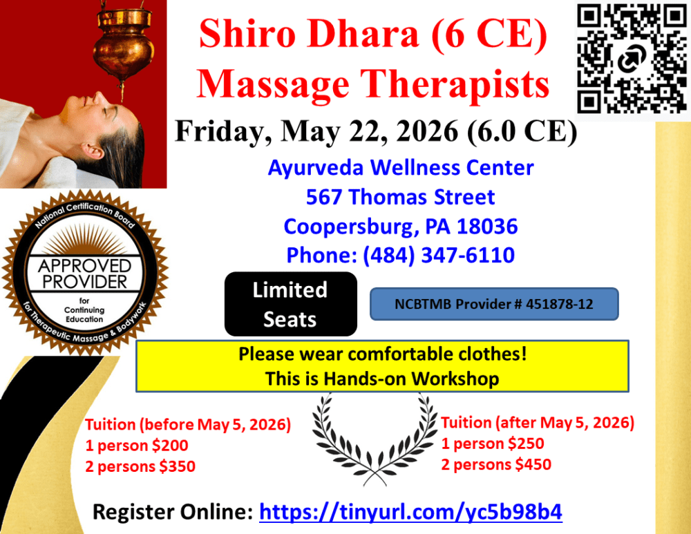 Where: Ayurveda Wellness Center, 567 Thomas Street, Coopersburg, PA 18036, Phone: 484-347-6110